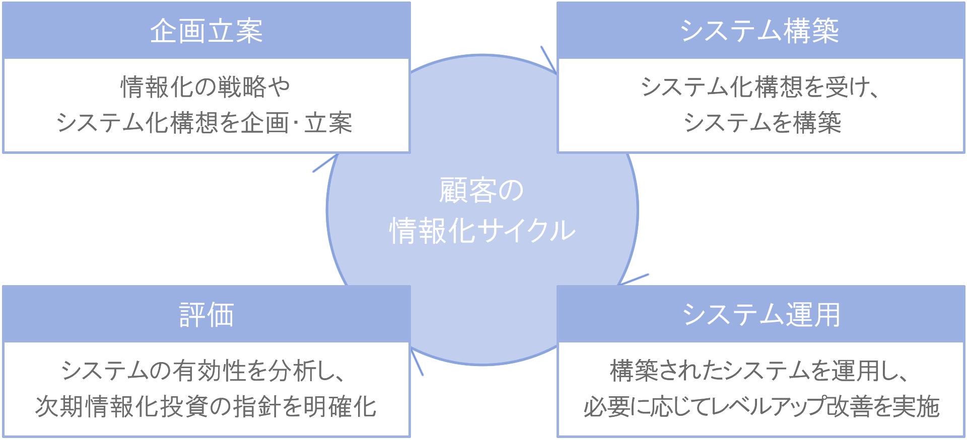 私たちのサービスは、顧客の情報化サイクルに応じて「プロフェッショナル・サービス」、「システムインテグレーションサービス」、「システムアウトソーシングサービス」の3つのサービス・ラインで構成されています。